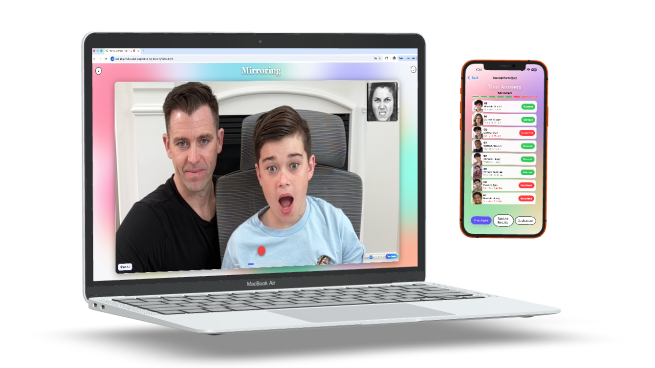 SocialQ believes that we can Train increased perception and understanding of Emotions for people with Autism Spectrum Disorder (ASD) by using Mirroring Training in AboutFace.